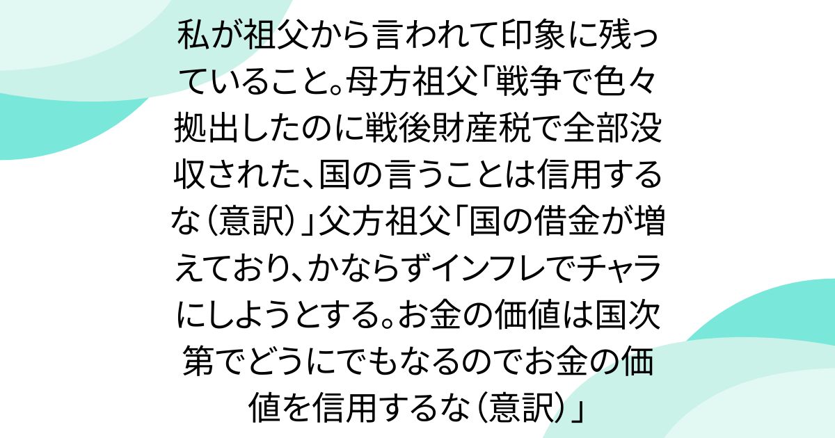 私が祖父から言われて印象に残っていること。母方祖父「戦争で色々拠出したのに戦後財産税で全部没収された、国の言うことは信用するな(意訳)」父方祖父「国の借金が増えており、かならずインフレでチャラにしようとする。お金の価値は国次第でどうにでもなるのでお金の価値を信用するな(意訳)」