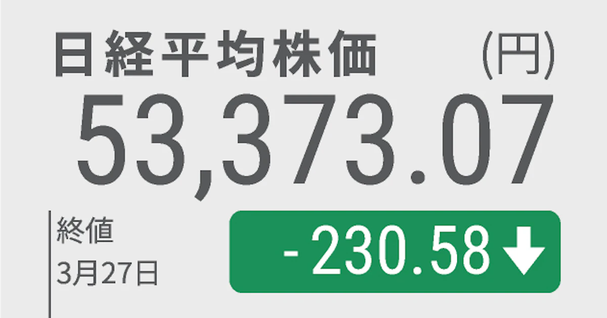 日本経済新聞 nikkei.com/article/DGXZQO… > 27日の東京株式市場で日経平均株価は続落し、終値は230円58銭安の5万3373円07銭だった。