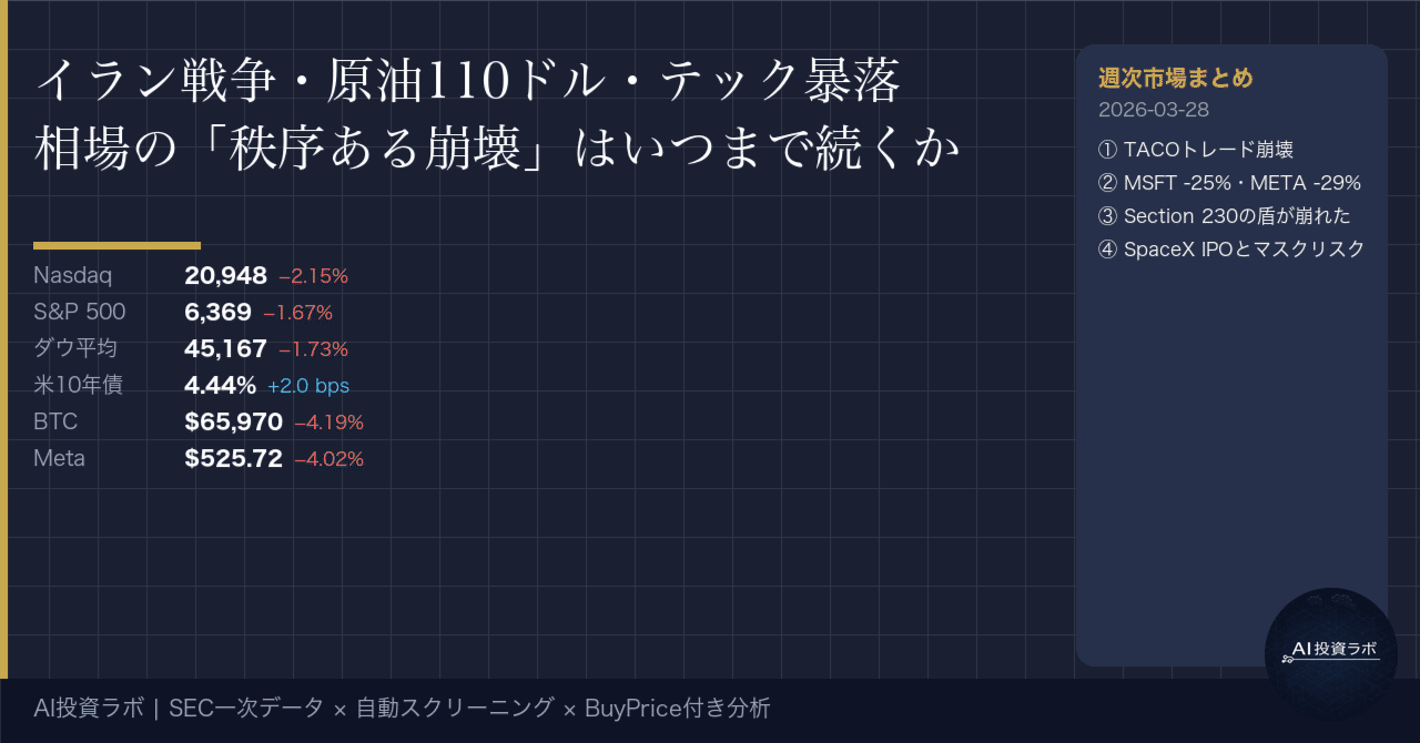 イラン戦争・原油110ドル・テック暴落——相場の「秩序ある崩壊」はいつまで続くか|AI決算分解|米国株判断ラボ