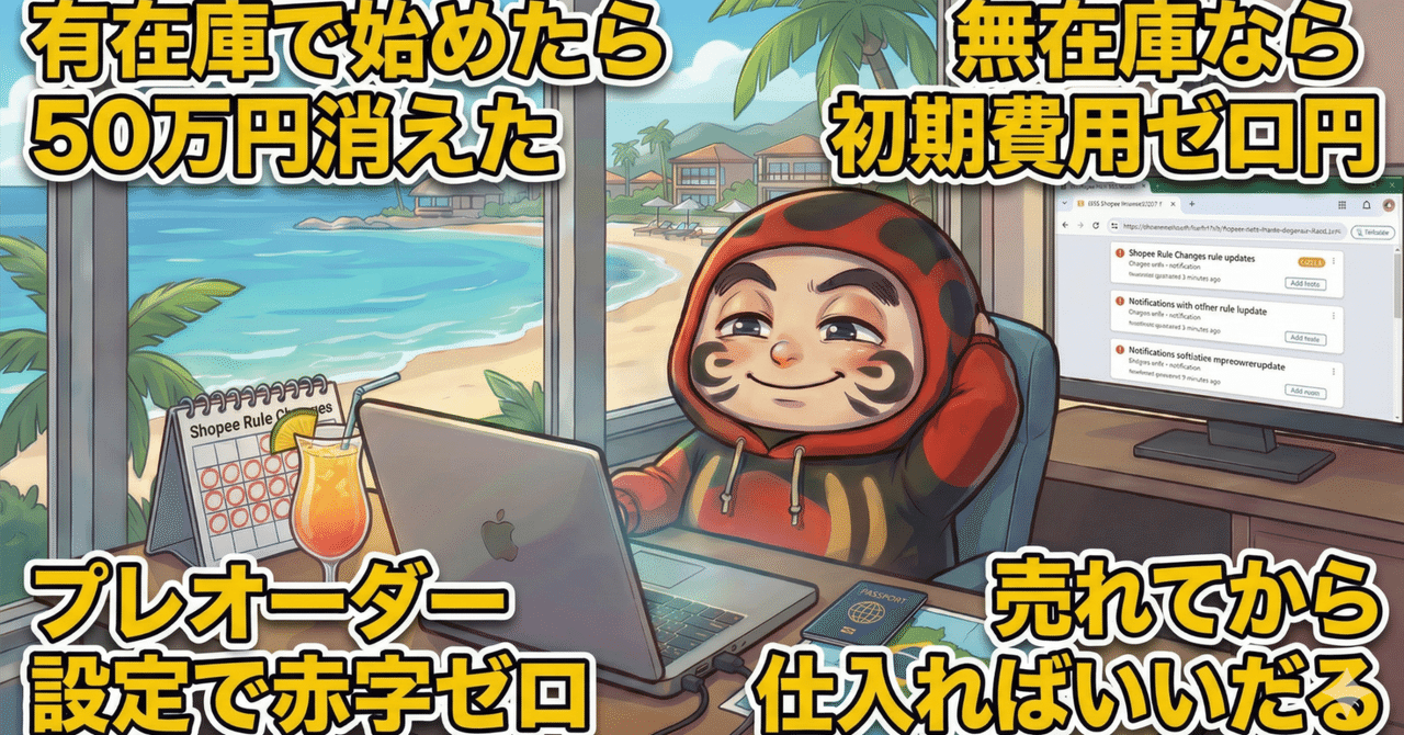 有在庫でShopee始めようとして、仕入れ資金を計算した瞬間に手が止まっただる。 無在庫なら初期費用ゼロ円で始められて、構造的に赤字が出ないだる。プレオーダー設定さえ知ってれば誰でもできる。