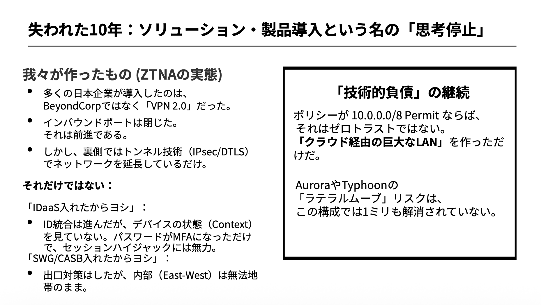 日本企業は10年で「VPN 2.0」を導入。ゼロトラストごっこを終わらせる現実的な生存戦略とは?ITmedia Security Week 2025秋で林達也氏が語る「真のゼロトラスト」と環境の決別。要点を一言で—実践と選択の答え。 #ITsecurity #ゼロトラスト ift.tt/ZUGBrcw