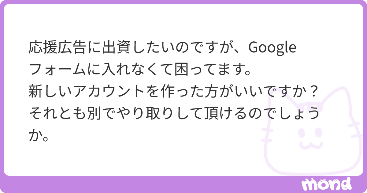 応援広告の出資に関してはGoogleフォームを使用する予定になります。 入れない場合、もう一度別のアカウントでお試しいただくか少し時間を置いて再度お試しください。 それでも尚フォームに入れない場合は対応… #mond_unokaimufd mond.how/ja/topics/d67m…