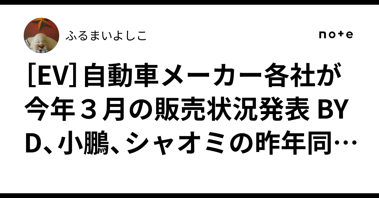[EV]自動車メーカー各社が今年3月の販売状況発表 BYD、小鵬、シャオミの昨年同期比が軒並み2桁減に|ふるまいよしこ