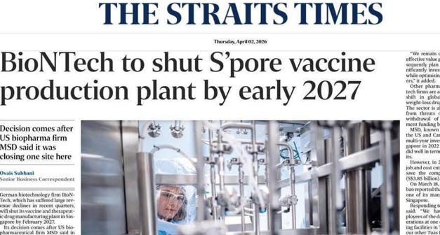 💥😆朗報‼️ ファイザー社と提携して、私たちに実験的な遺伝子ワクチンを推進したドイツの企業のBioNTech社は、シンガポールにあるアジア最大の主力ワクチン生産工場を2027年初頭までに閉鎖すると発表した。🎊 aussie17.com/p/…