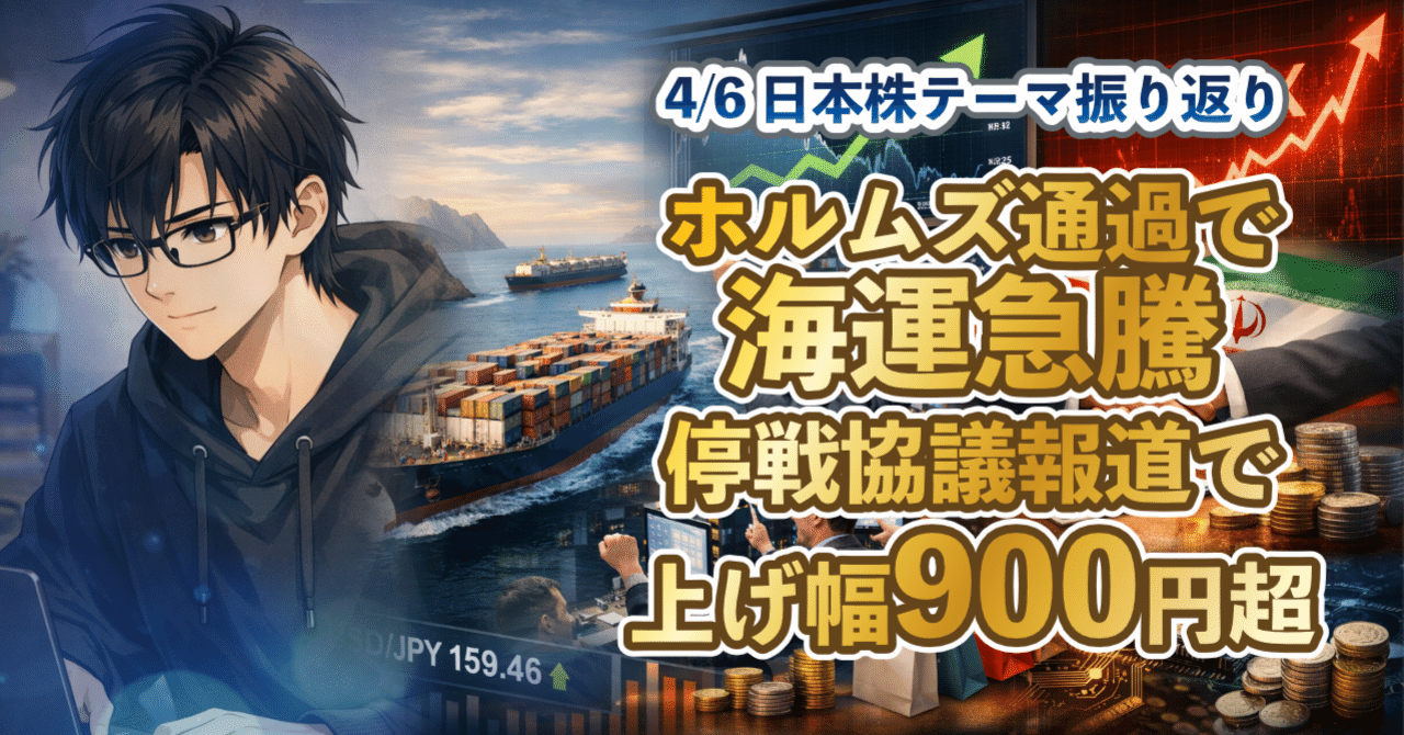 【4/6 日本株テーマ振り返り】ホルムズ通過で海運急騰、停戦協議報道で上げ幅900円超|ゆうたろ@テーマ株