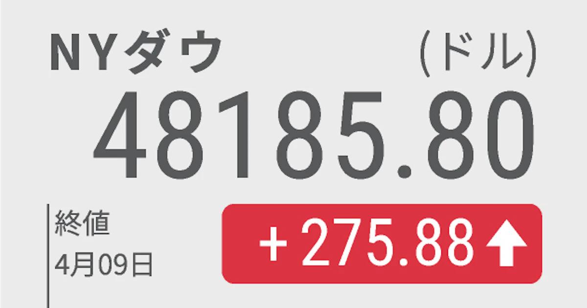9日の米株式市場でダウ工業株30種平均は前日比275ドル高の4万8185ドルと続伸した。イスラエルとレバノンの和平協議報道が好感され、買いが優勢となった。アマゾン等AI関連株が買われる半面、既存ソフト株は下落した。中東情勢の警戒は依然強い。 nikkei.com/article/DGXZQO…