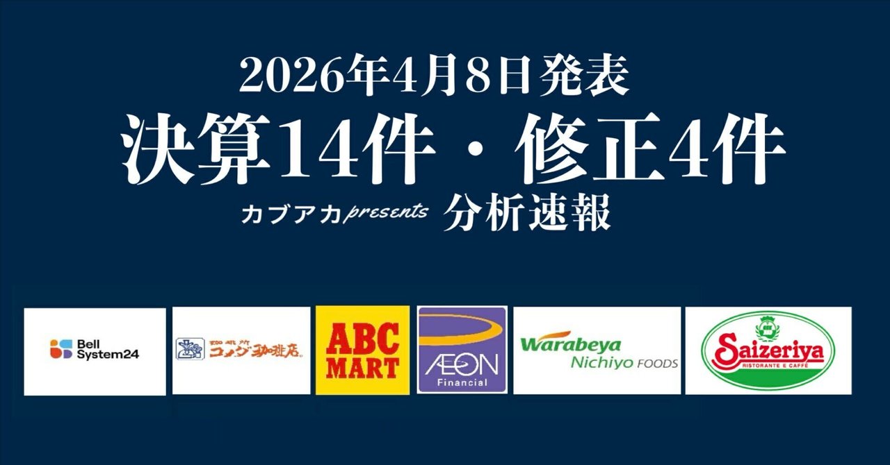 【速報!】4/8発表 決算14社、修正4社、ABCマート、イオンフィナンシャルサービス、サイゼリヤ、コメダ、ベルシステム24、わらべや日洋、ミニストップ、リソー教育、エヌ・ピー・シー、ジーフット、Gam|古賀真人@カブアカ