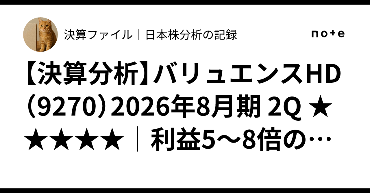 【決算分析】バリュエンスHD(9270)2026年8月期 2Q ★★★★★|利益5〜8倍の劇的改善、PER14倍で割安感大|決算ファイル|日本株分析の記録