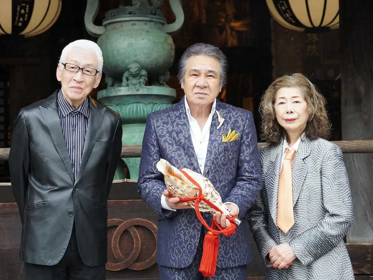 奈良・長谷寺で新曲「長谷寺の雨~晩秋の大和路~」を歌唱奉納する鳥羽一郎(中央)と、作詞した高畠じゅん子氏(右)、作曲した斉藤功氏 - スポニチ Sponichi Annex 芸能