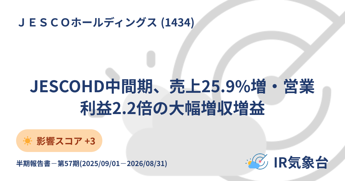JESCOホールディングス JESCOHD中間期、売上25.9%増・営業利益2.2倍の大幅増収増益 影響評価スコア+3 ☀️ 詳細.jp/disclosures/b2…