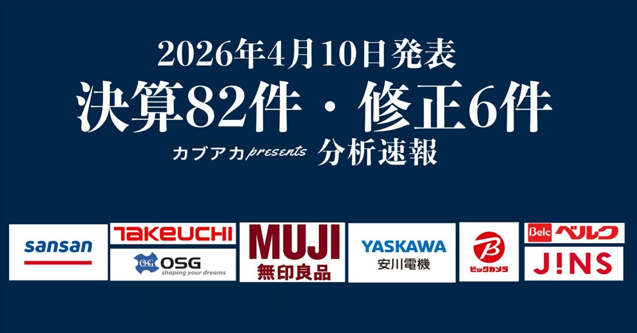 【速報!】4/10発表 決算82社、修正6社、良品計画、安川電機、竹内製作所、ビックカメラ、Sansan、日本毛織、ジンズ、ハイデイ日高、コシダカ、バリュエンスホールディングス、テイツー、SAAF、など|古賀真人@カブアカ