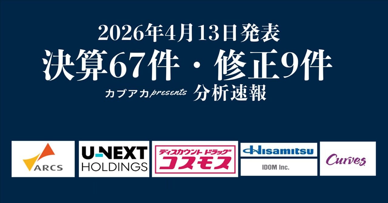 【速報!】4/13発表 決算67社、修正9社、コスモス薬品、久光製薬、U-NEXT、アークス、QPS、IDOM、コーナン商事、カーブス、リテールパートナーズ、ヤマダ、マースグループ、など|古賀真人@カブアカ
