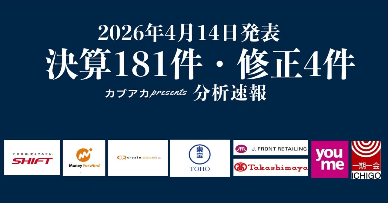【速報!】4/14発表 決算181社、修正4社、東宝、ベイカレント、J.フロント リテイリング、高島屋、クリエイト・レストランツ、SHIFT、マニー、ドトール・日レス、松屋、SFoods、ティーケーピー|古賀真人@カブアカ