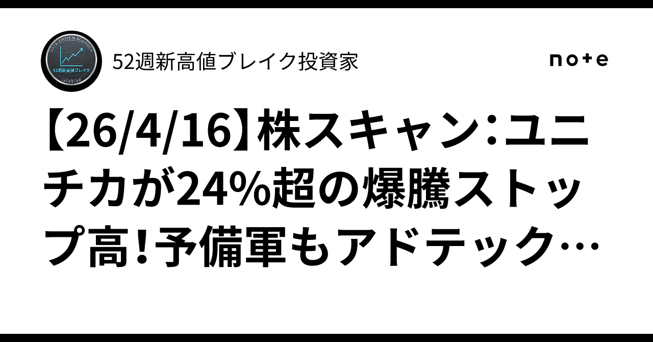 【26/4/16】株スキャン:ユニチカが24%超の爆騰ストップ高!予備軍もアドテックなど有力株が続々肉薄|52週新高値ブレイク投資家