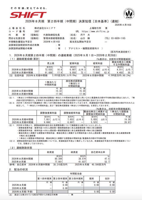 SHIFT 2026年8月期第2四半期決算 : 官報ブログ