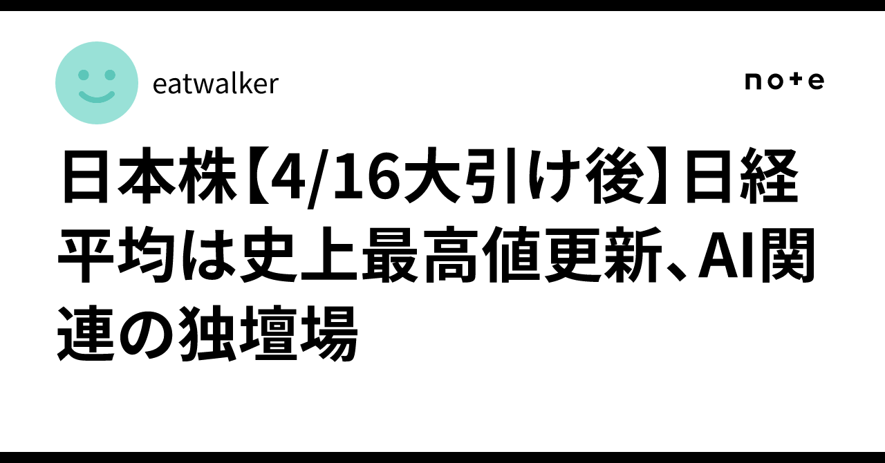 日本株【4/16大引け後】日経平均は史上最高値更新、AI関連の独壇場|eatwalker