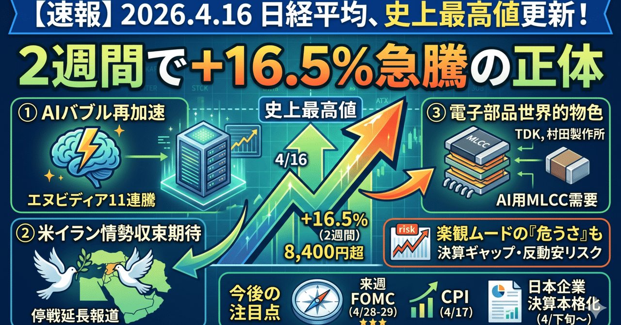 【速報】2026.4.16 日経平均、史上最高値更新!2週間で+16.5%の急騰の正体|poaro@現役IFA・証券アナリスト
