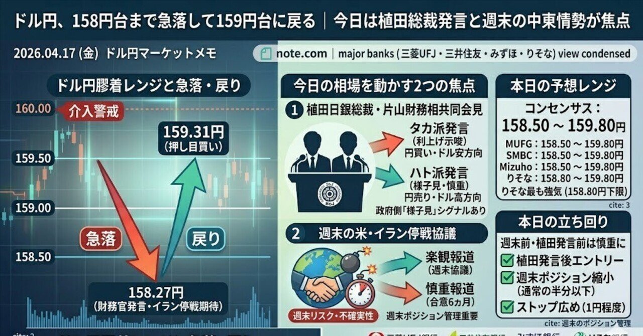 ドル円、158円台まで急落して159円台に戻る|今日は植田総裁発言と週末の中東情勢が焦点|佐伯 百
