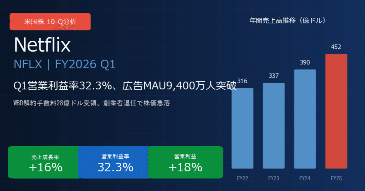ネットフリックス / Netflix(NFLX)決算分析|営業利益率32.3%の本業好調とWBD破談後の戦略的空白、調整後EPS+4.3%の実態【FY2026 Q1 10-Q分析個別企業日本語解説】|米国株シグナルラボ