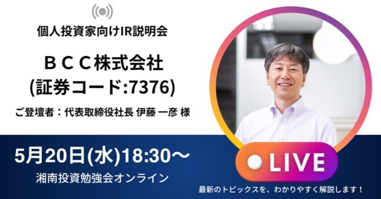 5月20日開催の個人投資家向け説明会(湘南投資勉強会様主催)に登壇します!|BCC株式会社 IR担当(東証グロース 7376)