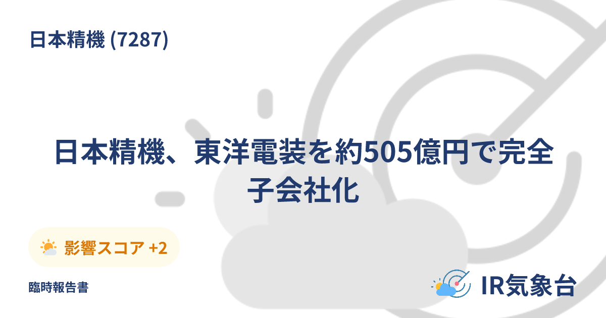 日本精機 日本精機、東洋電装を約505億円で完全子会社化 影響評価スコア+2 🌤️ 詳細.jp/disclosures/b4…