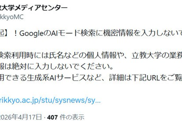 Google検索「AIモード」に個人情報を入力しないで――立教大など、学内に注意喚起(ITmedia NEWS)