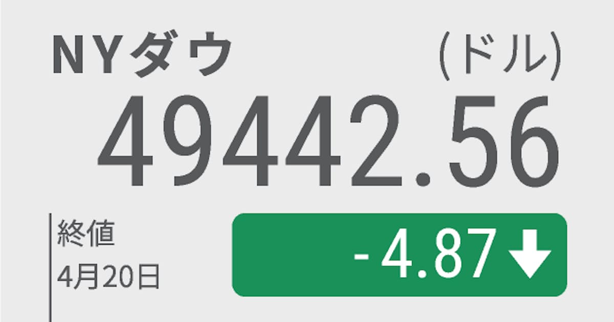 日本経済新聞 nikkei.com/article/DGXZQO… > 20日の米株式市場でダウ工業株30種平均は、前週末比4ドル87セント安の4万9442ド56セントと小幅に反落した。米国とイランの停戦協議を巡って再び不透明感が強まり、慎重な取引が目立った。