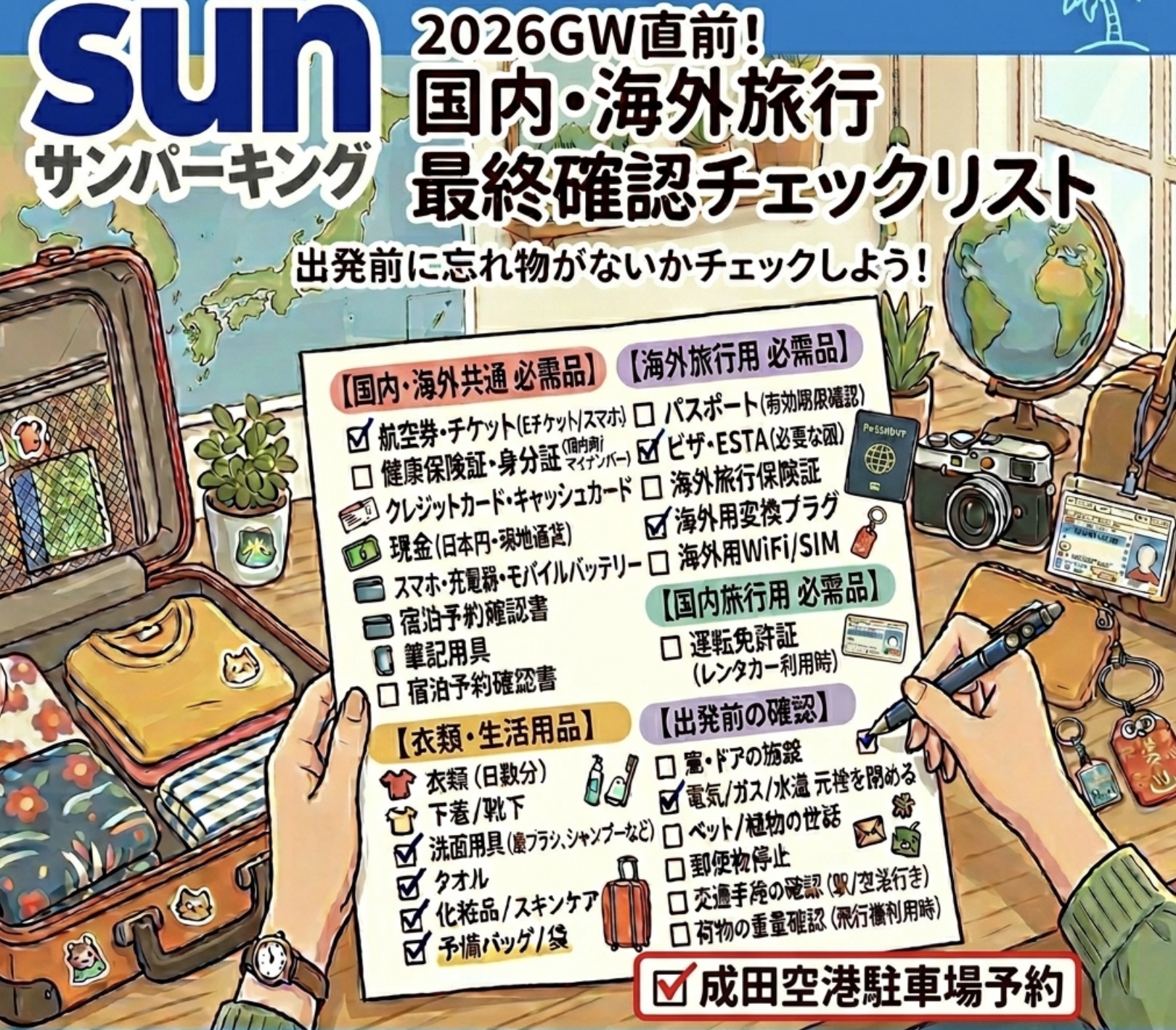 【2026ゴールデンウィーク直前情報ℹ️】そら旅✈️最終チェックはお済みですか?✅成田空港駐車場予約もお忘れなく! | 【公式】成田空港駐車場サンパーキング | 顧客満足No.1