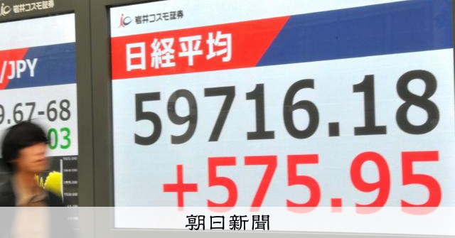 日経平均、最高値5万9716円 中東情勢の懸念後退で575円上昇:朝日新聞