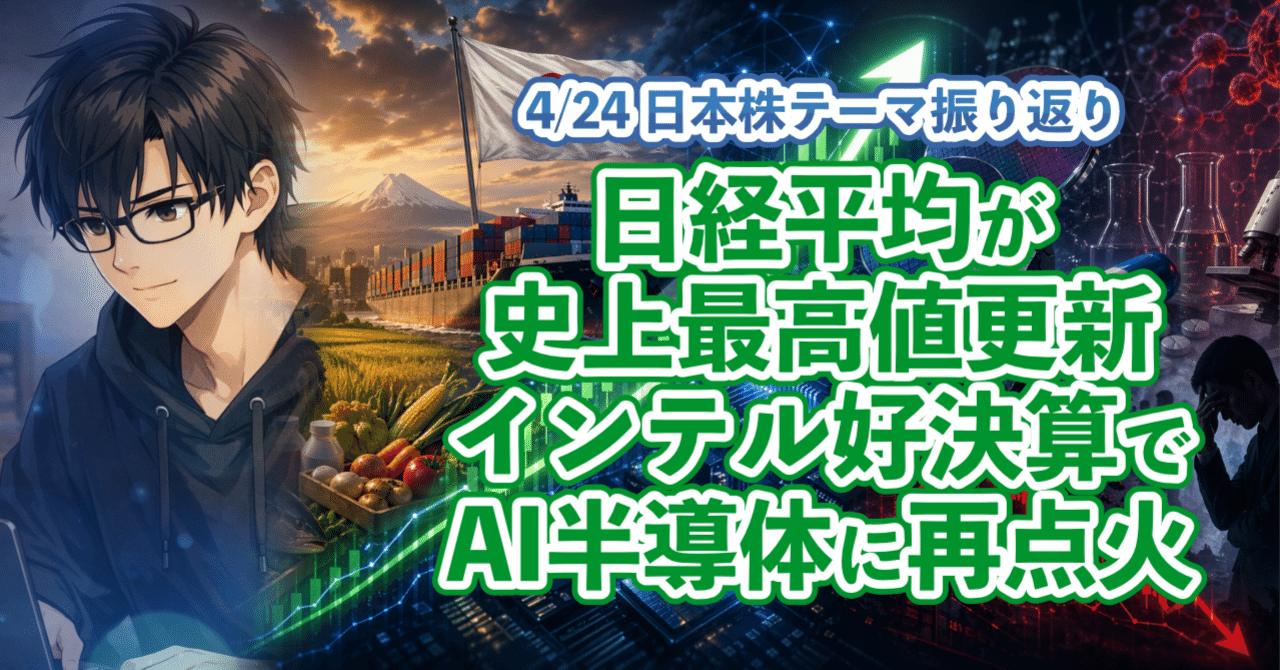 【4/24 日本株テーマ振り返り】日経平均が史上最高値更新、インテル好決算でAI半導体に再点火/バイオ・医薬品は第一三共ショックで急落|ゆうたろ@テーマ株