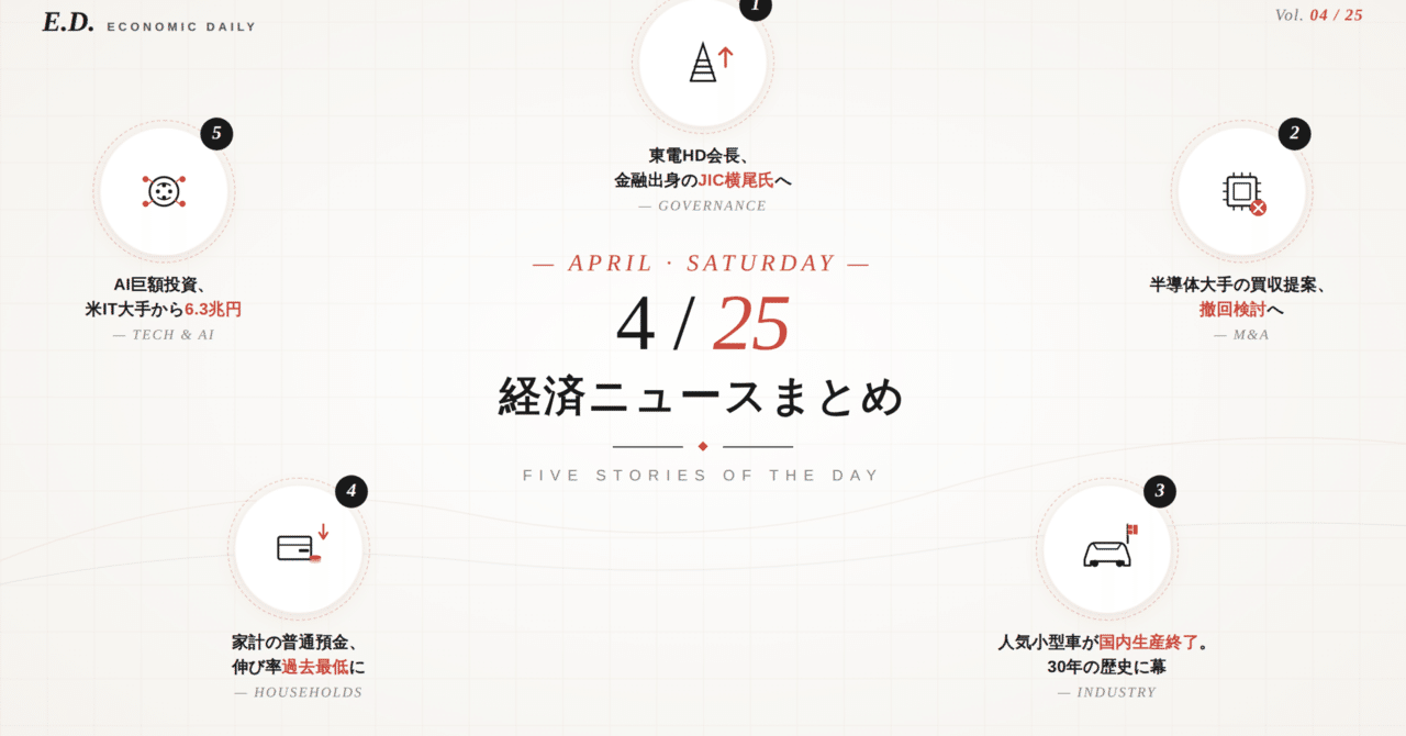 普通預金の伸び率0.6%が過去最低。 “預けっぱなし”の時代が静かに終わってる感じ、ありますよね。 4/25は東電の会長交代やデンソーのローム買収撤回検討も。中長期で効きそうな話を5本まとめました。 #note #経済ニュース note.com/tokeera_18/n/n…