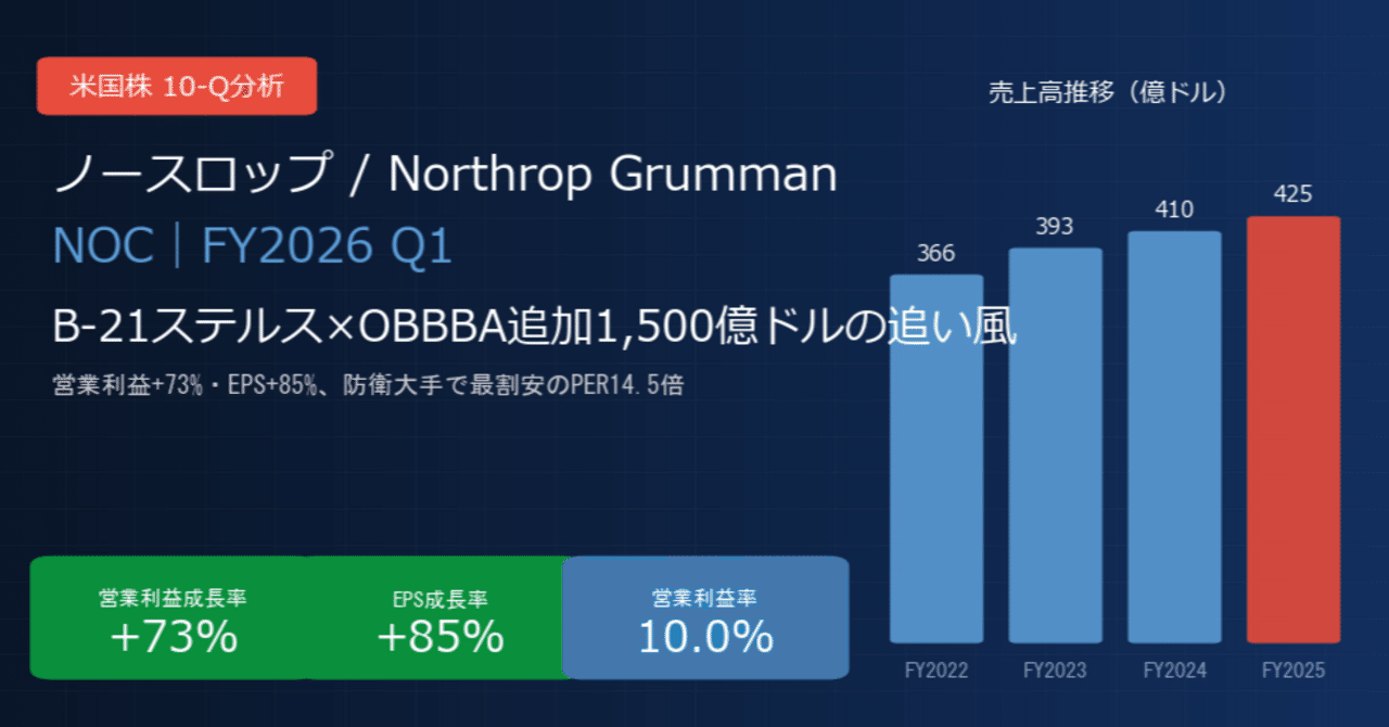 ノースロップ・グラマン / Northrop Grumman(NOC)決算分析|B-21損失一巡で営業利益+73%、OBBBA追加1,500億ドルの追い風【FY2026 Q1 日本語解説】|米国株シグナルラボ