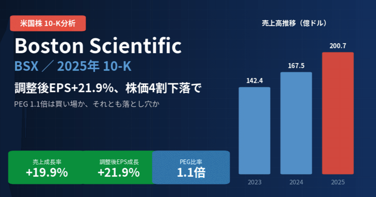 ボストン・サイエンティフィック / Boston Scientific(BSX)決算分析|調整後EPS+21.9%、株価4割下落でPEG 1.1倍の買い場到来か【2025年10-K 個別企業日本語解説】|米国株シグナルラボ